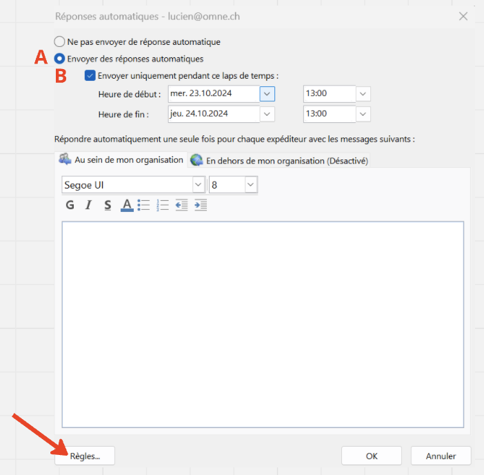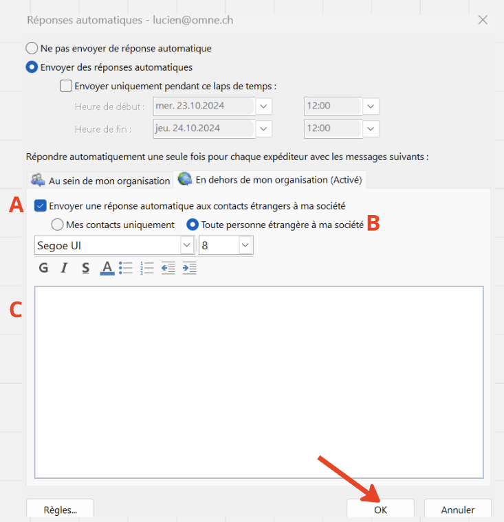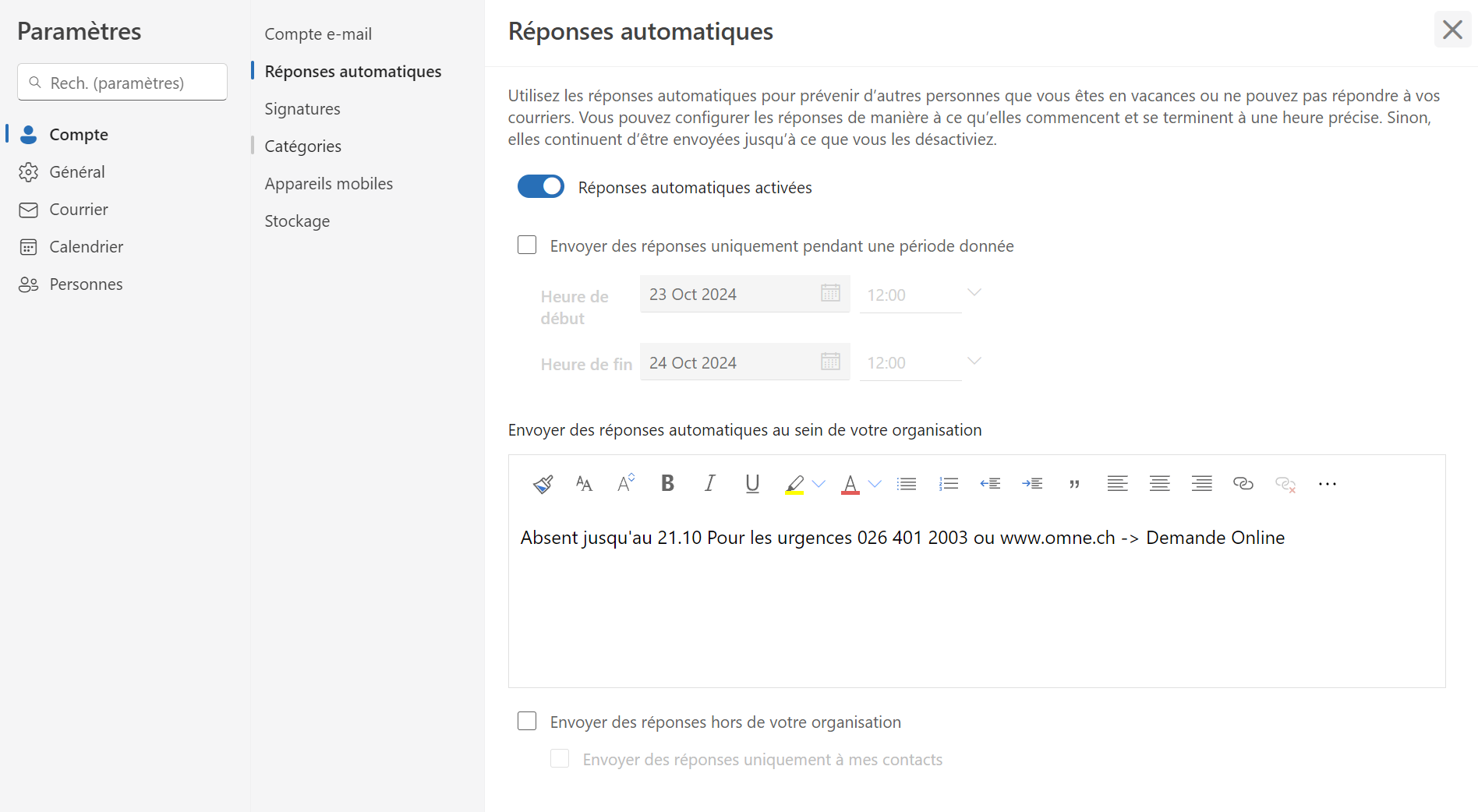 - A: Activer les réponse automatique en dehors de votre organisation