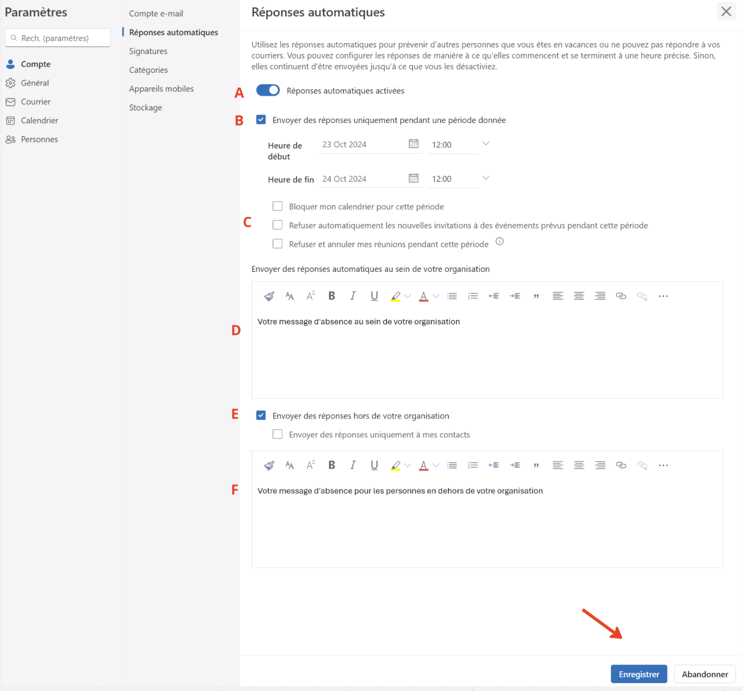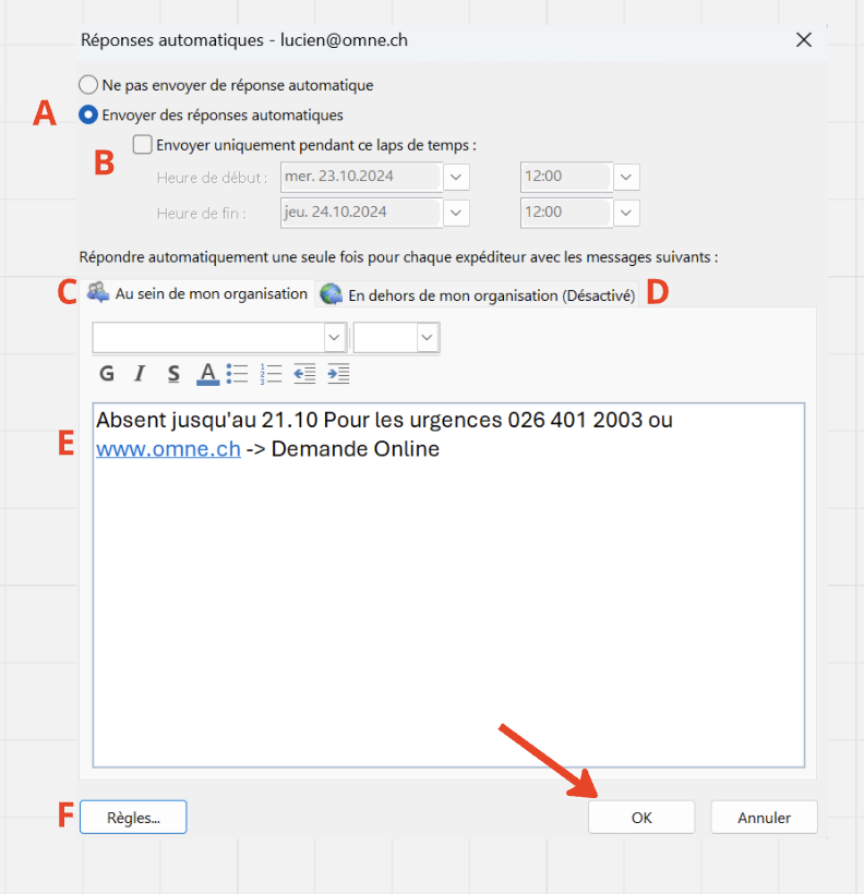 - E: Activer l'envoi de message automatique en dehors de votre organisation