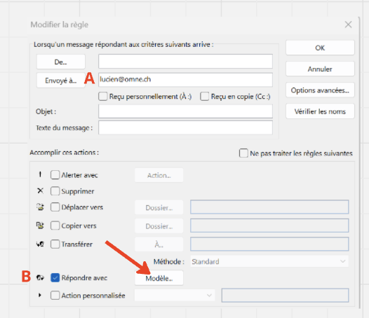 - B: Activez "Répondre avec" et cliquez Modèle